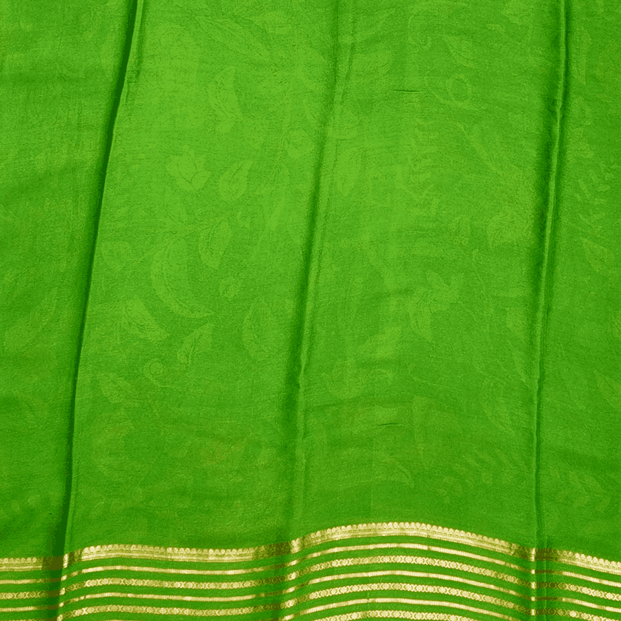 Saree Design: Bold leafy motifs on the pallu with shimmering gold zari stripes and intricate border work